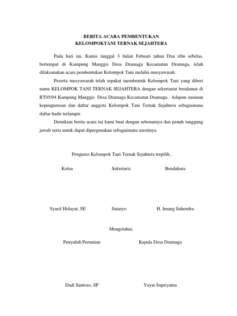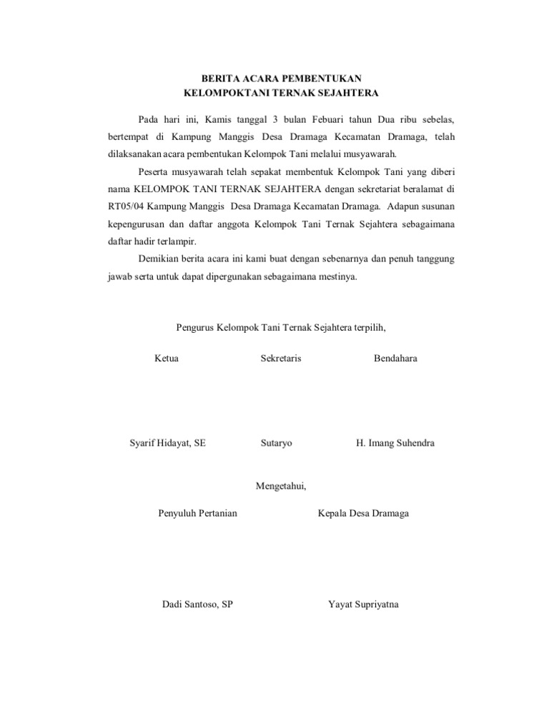Pembentukan kelompok tani harus melibatkan petani dalam wilayah tersebut secara luas sejak awal. Gambar 6.2 fgd kelompok wanita tani dahlia tentang. 37 full pdfs related to this paper. Asosiasi komoditas pertanian adalah kumpulan dari petani, kelompok tani, dan/atau gabungan kelompok tani untuk memperjuangkan kepentingan petani. Pembentukan kelompok tani perlu dilaksanakan melalui musyawarah yang selanjutnya dituangkan dalam berita acara pembentukan kelompok tani. Ayu kumala sari 135130018 program studi agribisnis fakultas pertanian universitas pembangunan. Ketua kelompok tani karunia, mantri tani kec. Berdasarkan analisis, tujuan pelaksanaan program kemitraan masyarakat adalah untuk mengetahui Berita acara pembentukan kelompok 3. Sebagian besar kelompok tani yang ada masih dalam taraf pembentukan kelompok, secara formal memiliki seorang pemimpin namun kontak tani masih belum aktif dan kegiatan kelompoknya bersifat informatif. Syahyuti, 2012 dalam analisis kritis terhadap permentan no. Nagrak desa sindangraja kecamatan jamanis t. Gabungan kelompok tani yang selanjutnya disebut gapoktan adalah kumpulan beberapa kelompok tani yang bergabung dan bekerjasama untuk meningkatkan skala ekonomi dan efisiensi usaha.